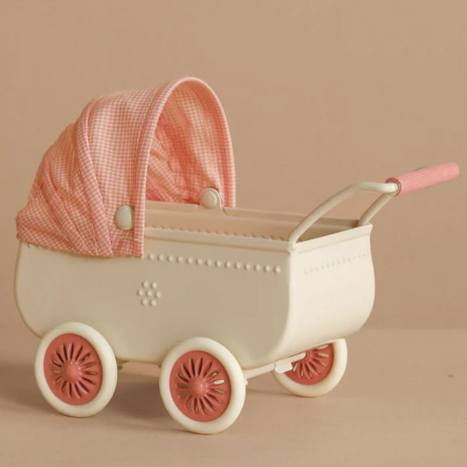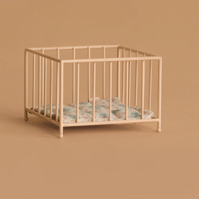 Keep your baby safe in a sweet playpen. This size fits all friends in size My and baby mouse perfectly. The playpen is in metal and painted in a rose tone. In the bottom is a soft mattress covered with unique Maileg fabric.